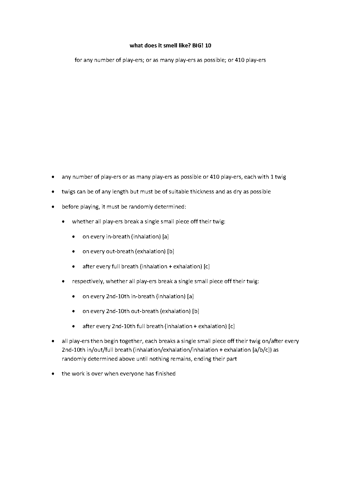 | Instrumentation | any number of play-ers or as many play-ers as possible or 410 play-ers, each with 1 twig |