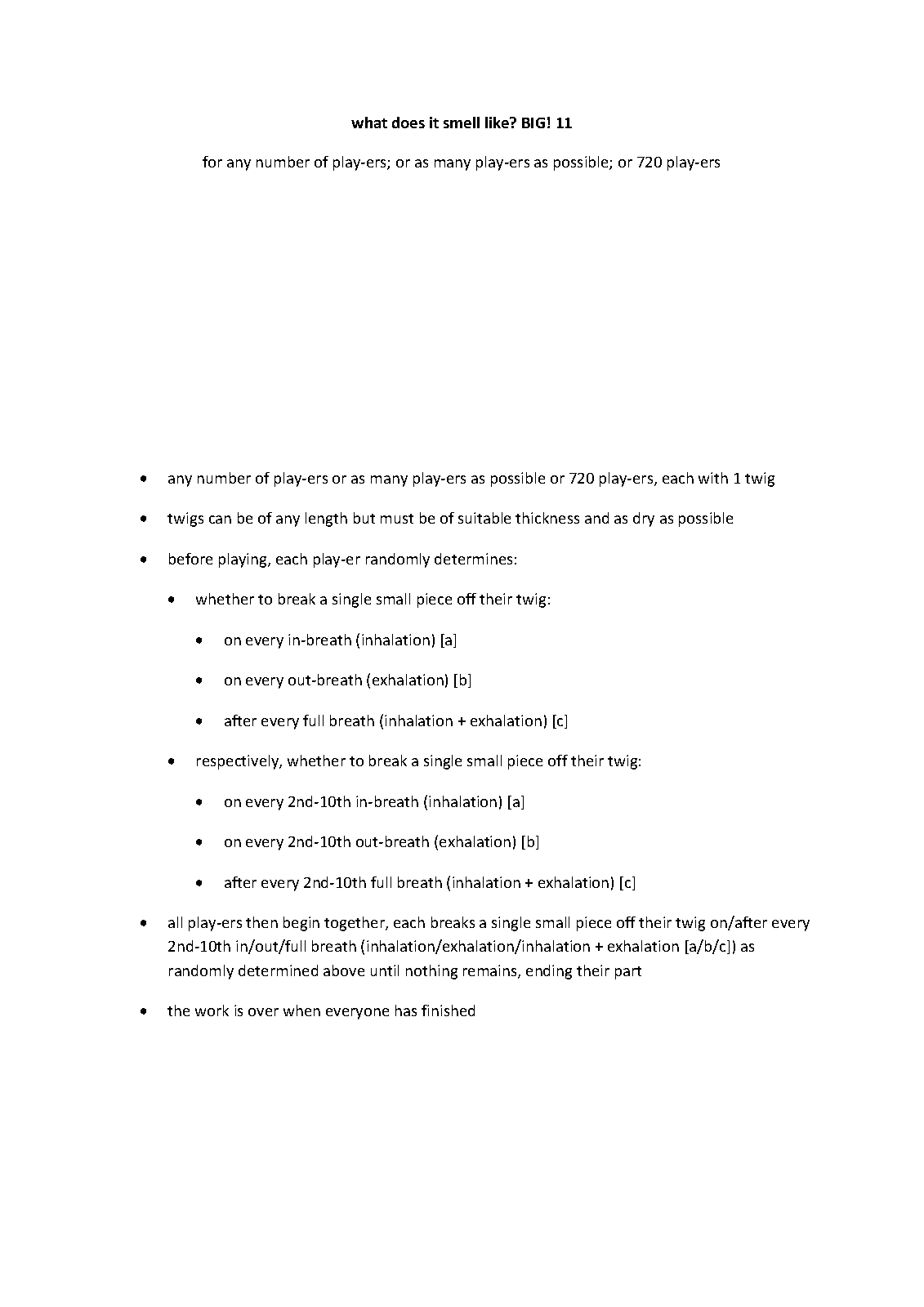 | Instrumentation | any number of play-ers or as many play-ers as possible or 720 play-ers, each with 1 twig |