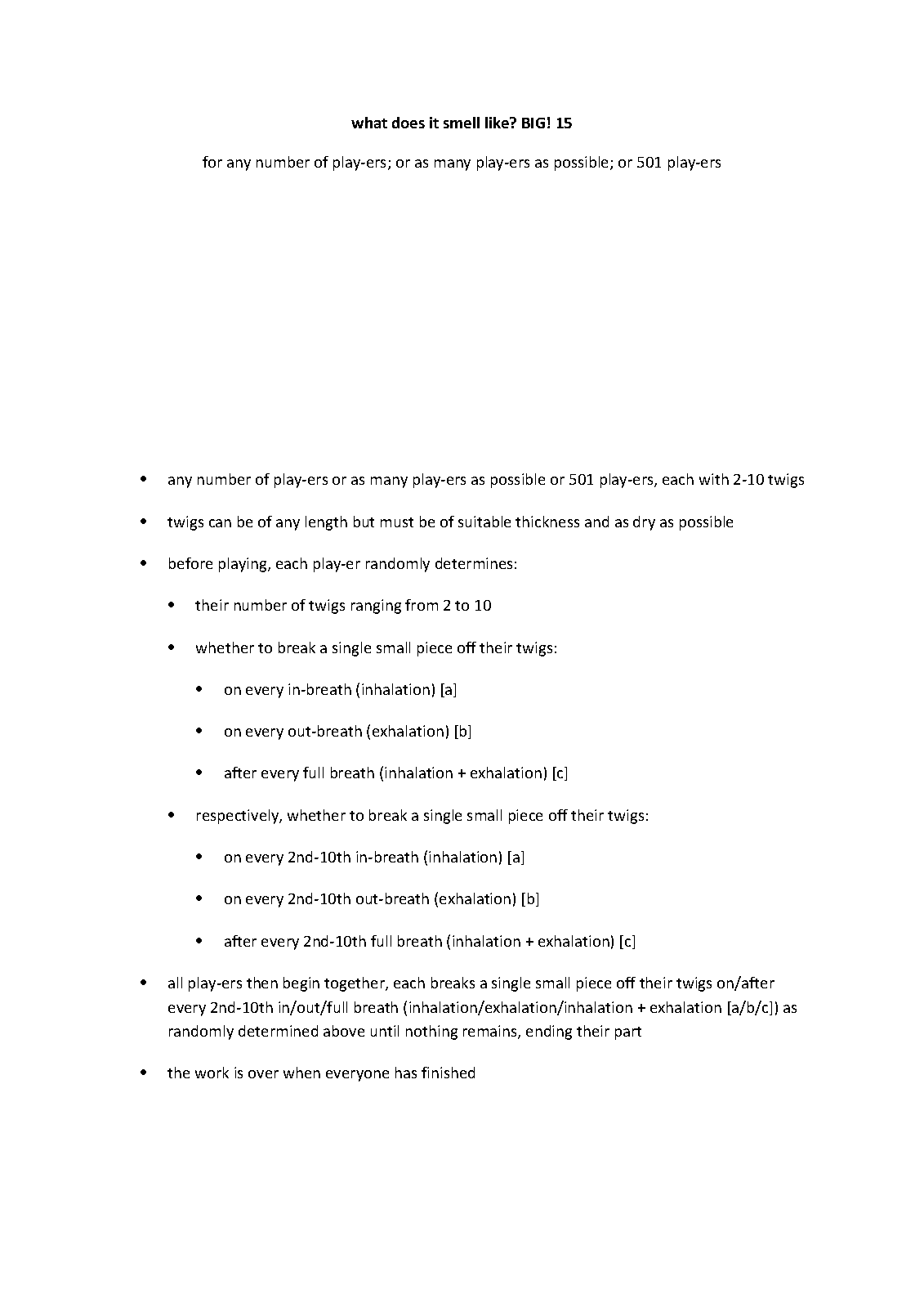 | Instrumentation | any number of play-ers or as many play-ers as possible or 501 play-ers, each with 2-10 twigs |