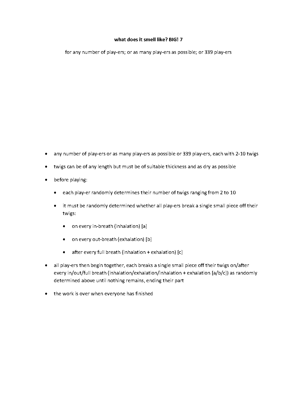 | Instrumentation | any number of play-ers or as many play-ers as possible or 339 play-ers, each with 2-10 twigs |