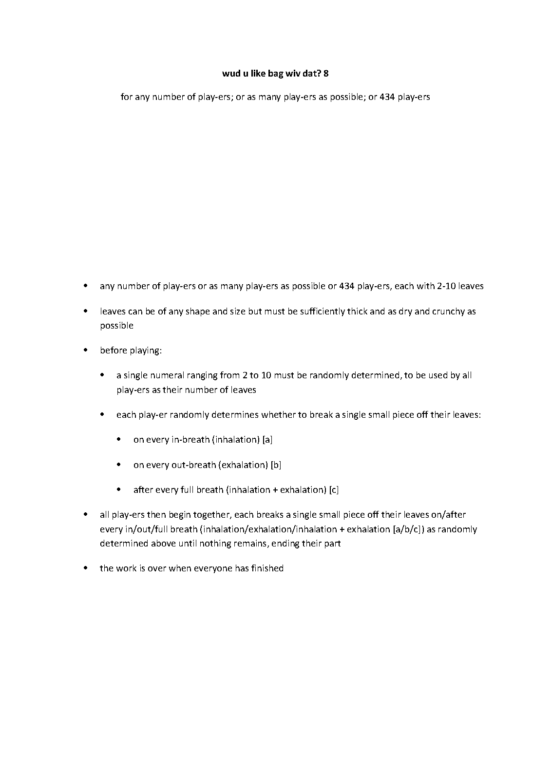 | Instrumentation | any number of play-ers or as many play-ers as possible or 434 play-ers, each with 2-10 leaves |