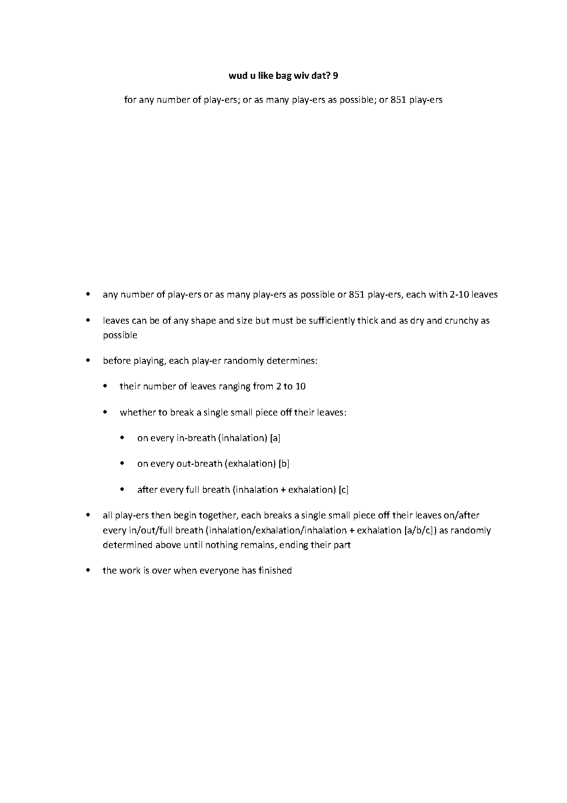 | Instrumentation | any number of play-ers or as many play-ers as possible or 851 play-ers, each with 2-10 leaves |