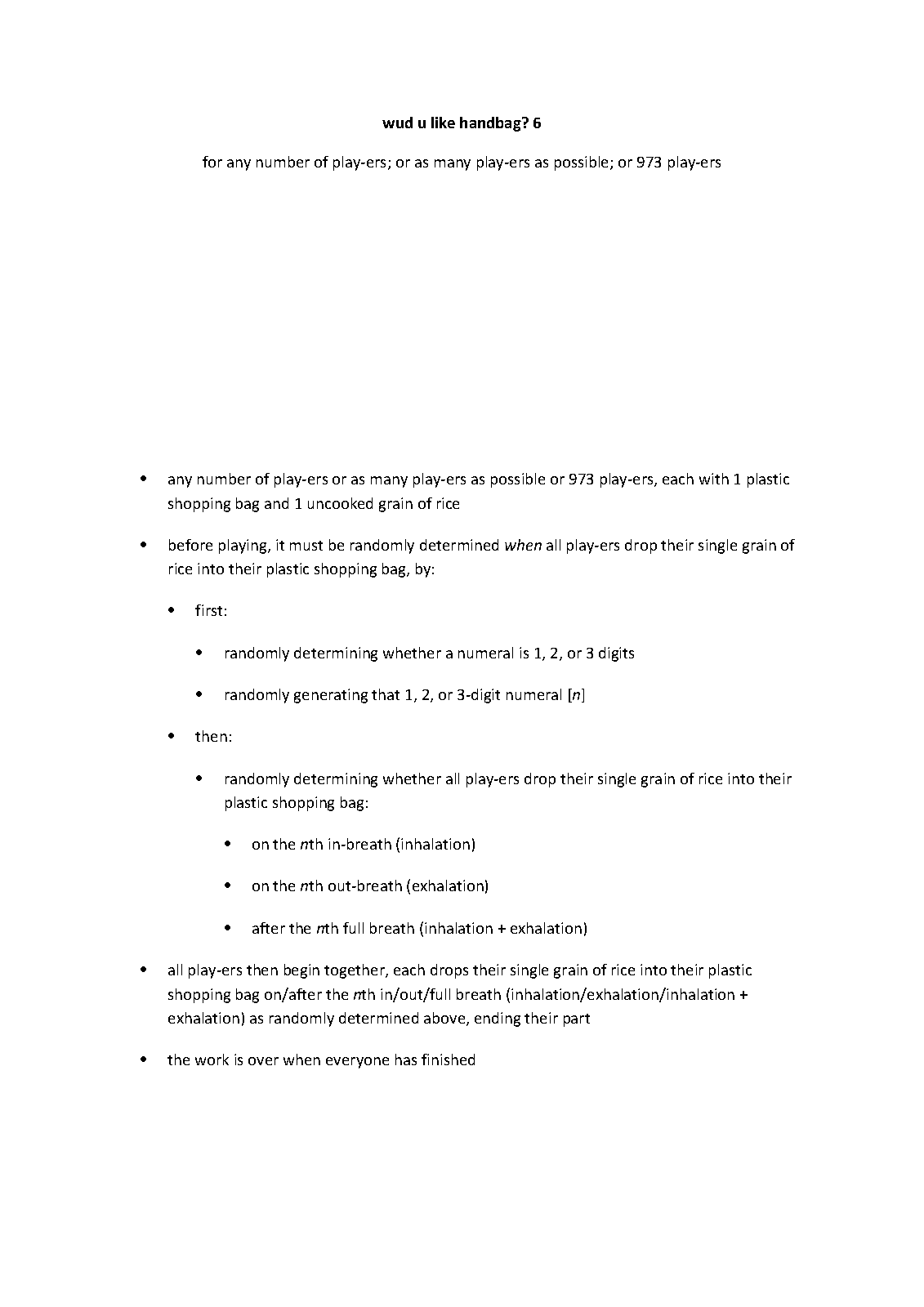 | Instrumentation | any number of play-ers or as many play-ers as possible or 973 play-ers, each with 1 plastic shopping bag and 1 uncooked grain of rice |