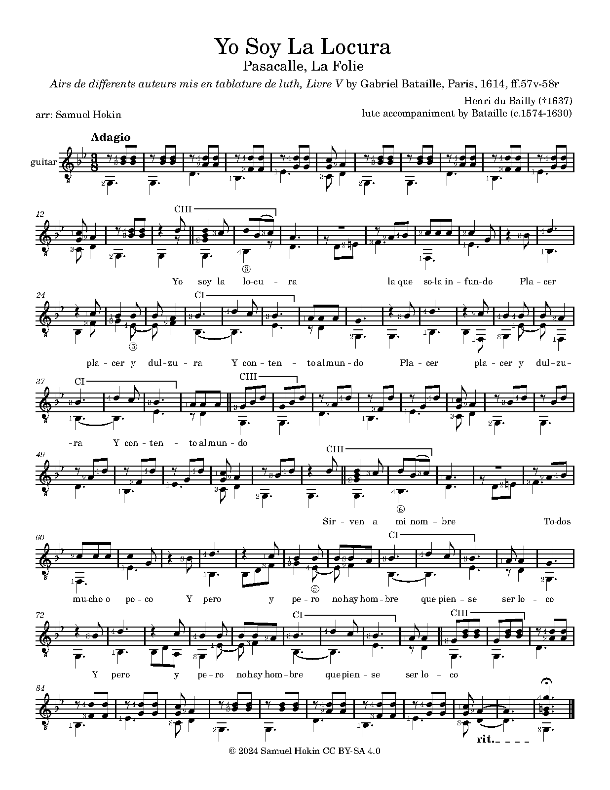 | Extra Information | This piece is popular with Baroque ensembles, and has been recorded by L'Arpeggiata (with Christina Pluhar and Phillipe Jaroussky), La Galanía (with Raquel Andueza), and Cembaless. It is one of only three extant songs by du Bailly. It appears in the 1614 lute tablature collection "Airs de différentes autheurs, mis en tabulature de luth, Cinquiesme Livre" by Gabriel Bataille. |