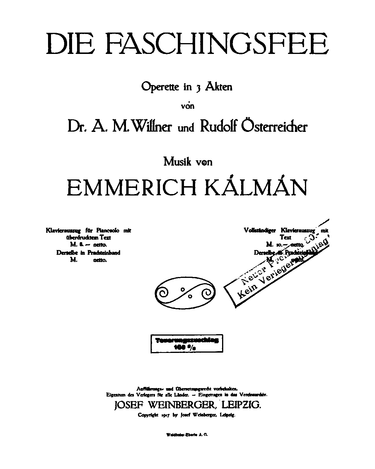 | First Performance. | 1915-02-23 in Budapest, Vig Theatre (original) 1916-09-25 in New York, New Amsterdam Theatre (Miss Springtime) 1917-09-21 in Vienna, Johann Strauss-Theater (Die Faschingsfee) |